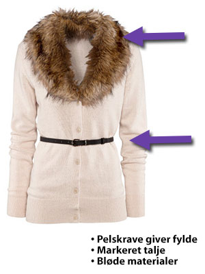 - Vælg gerne overdele i bløde materialer, da det giver fylde og blødhed til din overkrop.