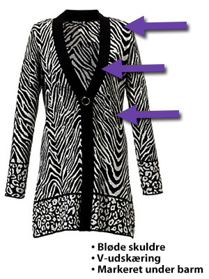 Som Elaine er det meget vigtigt, at du tænker i vertikale linjer, når du vælger overdele. Det vil sige, at de altid skal være længere, end de er brede og meget gerne, at de er åbne ned midt for og ikke er lukkede sweaters. På den måde får du skabt 3 lange slanke felter, når du ses forfra, hvilket giver indtryk af en højere og slankere figur. Derudover skal du også tænke vertikalt i forhold til mønstre, hvilket vil sige, at mønstre skal gå på langs og ikke f.eks. være horisontale striber.